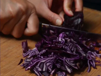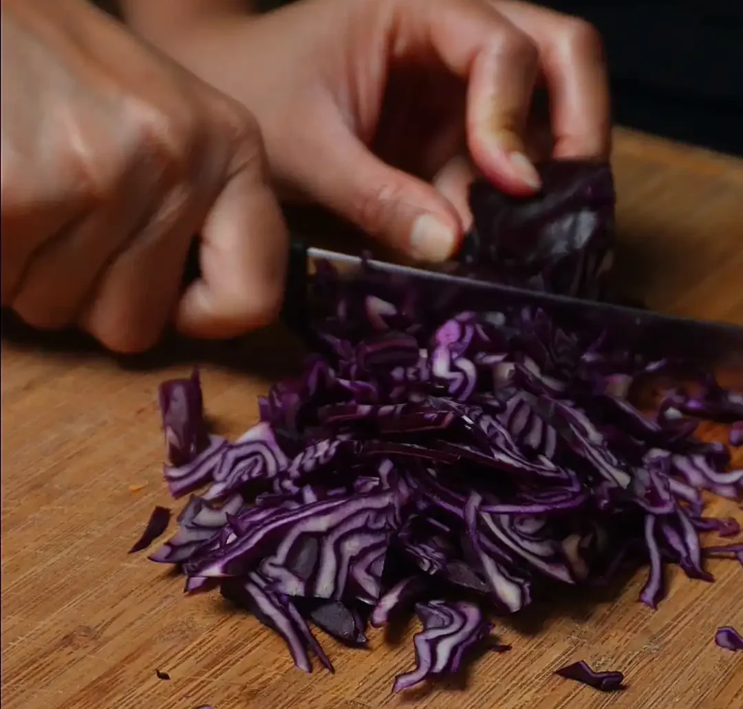 • Add shredded cabbage + julienned carrot to a bowl.