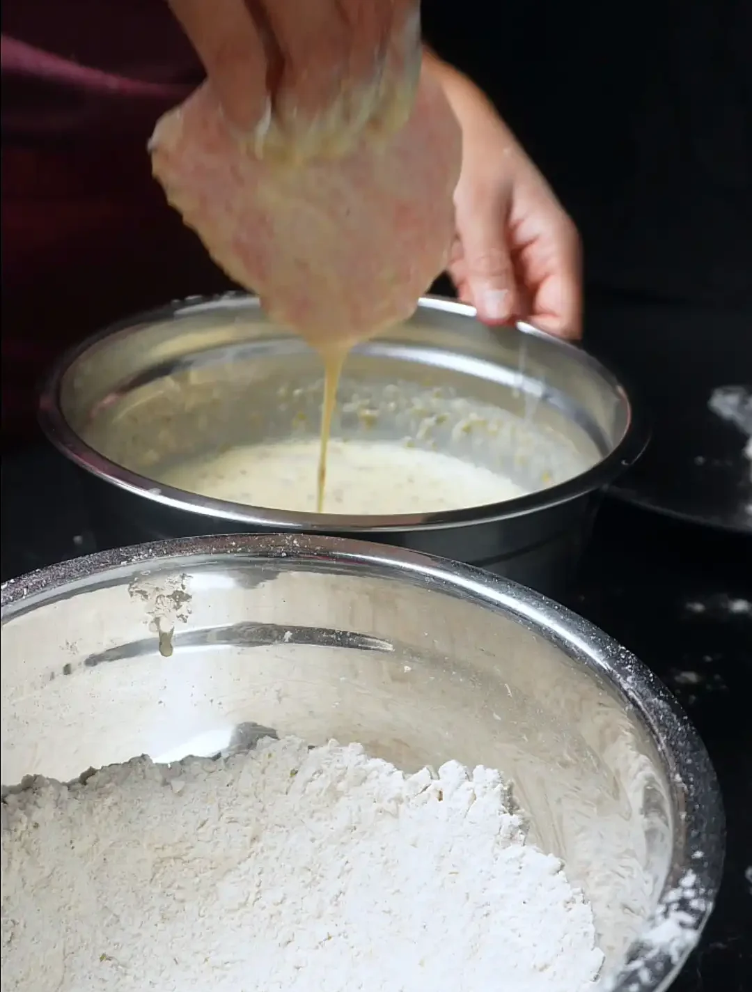 • In a shallow dish: flour + cornstarch + baking powder + coating seasonings.