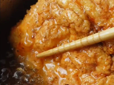 Pour neutral frying oil into a pot or deep pan (you want enough depth so the chicken can fry evenly). Heat the oil until it’s hot. If you don’t have a thermometer, use a wooden spoon handle or chopstick: dip it in—if bubbles form steadily around the wood, the oil is ready.