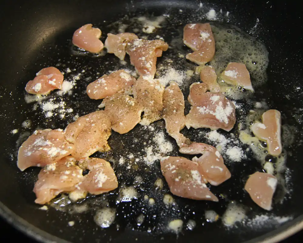 In the same pan used for toasting the almond slivers, add half of the butter. Once melted, add the chicken pieces in batches. Cook each batch until browned on all sides, sprinkling with a little flour, salt, and pepper as it cooks. Once browned, set the chicken aside.