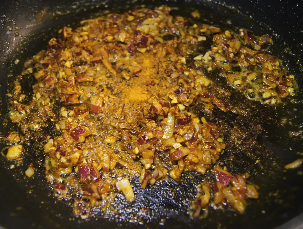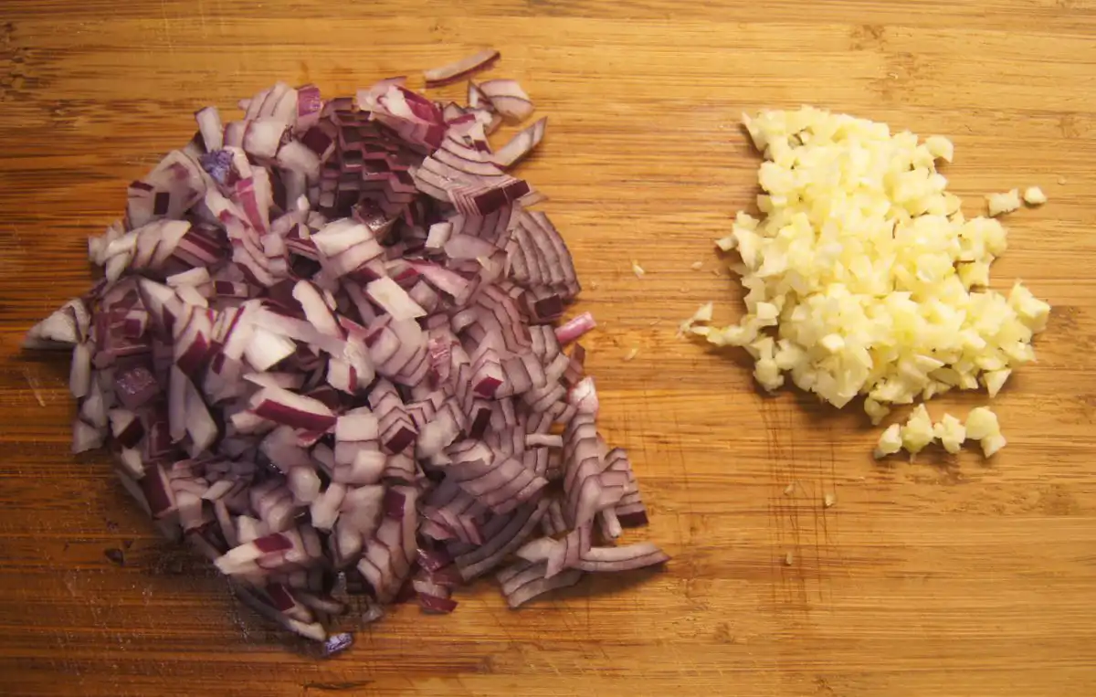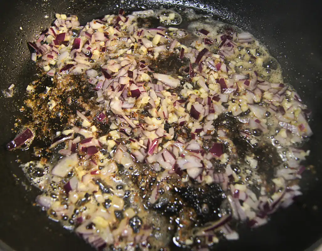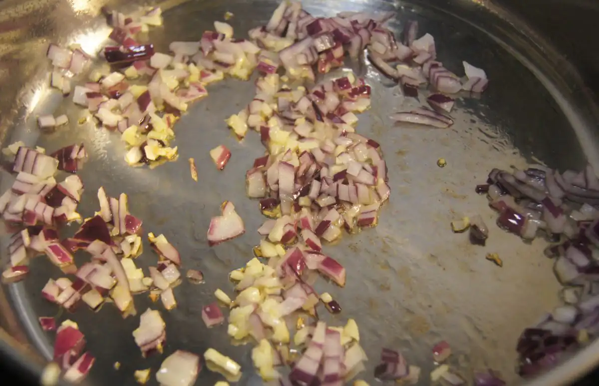 - In a separate pan, heat a little oil over medium-high heat. Add half of the chopped onion and minced garlic. Sauté until the onion is translucent and the garlic is fragrant.