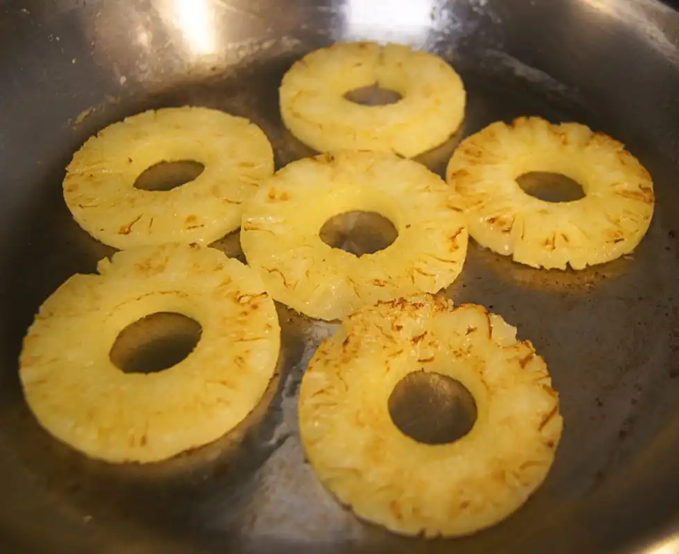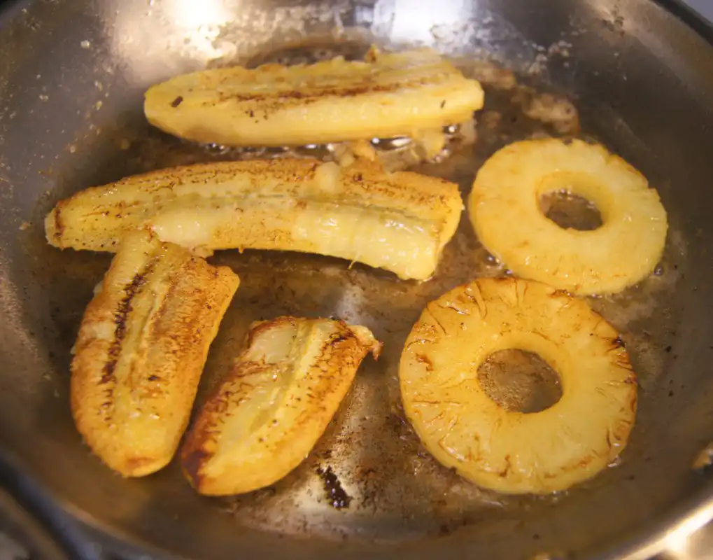 - Cut the bananas in half lengthwise. In a separate pan, melt the remaining butter over medium heat. Add the pineapple and banana slices, frying until golden brown and caramelized.