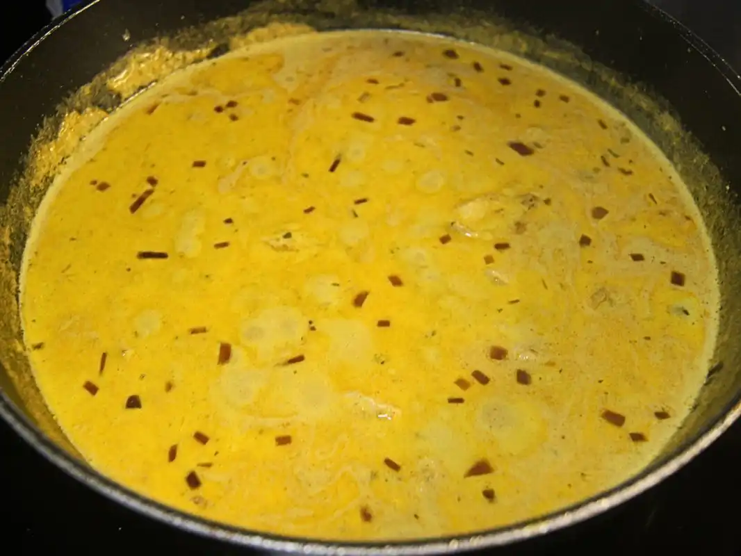 - In the same pan, add the remaining chopped onion and minced garlic. Stir in the curry powder and cook until the onions are wilted and fragrant.Pour in the cream, stirring to combine. Cook for 5 minutes over medium-high heat until the sauce thickens slightly.