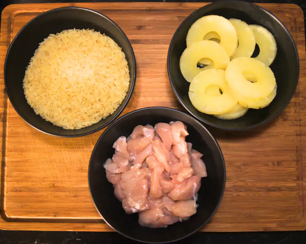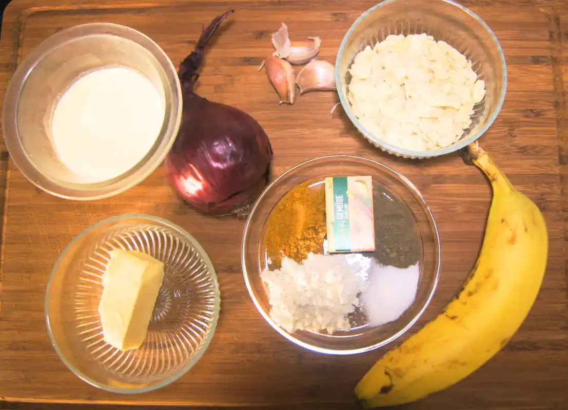 - Prepare the ingredients: Cut 600g of chicken into small pieces. Finely chop 1 onion and mince 2 garlic cloves. Measure 2 cups of parboiled rice. Prepare 2 bananas and 4 slices of canned pineapple. Set aside 4 tablespoons of butter, 20g of almond slivers, and 2.5 dl of cream. Measure 1 tablespoon of flour, 1 tablespoon of curry powder, and have salt and pepper ready to taste.