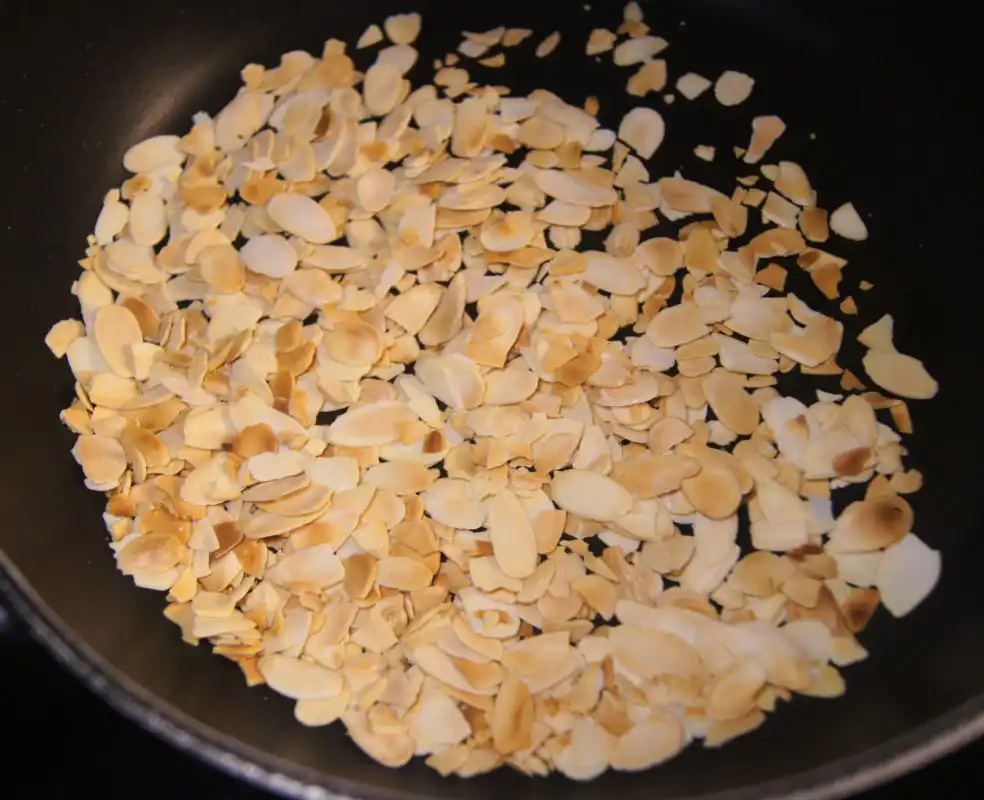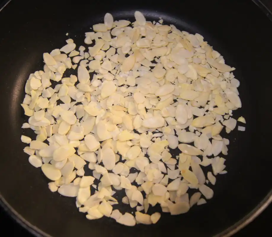 - In a dry skillet over medium heat, add the almond slivers. Toast them, stirring frequently, until golden brown and fragrant. Be careful not to burn them. Set aside.