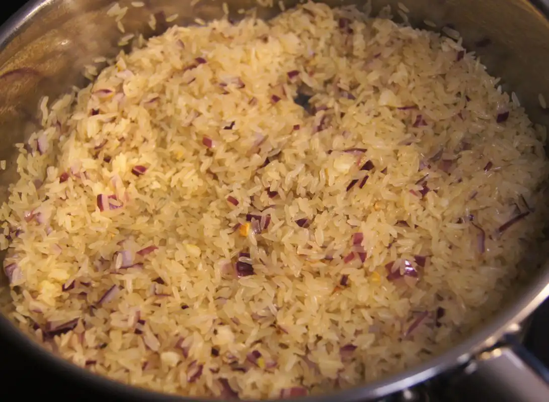 - Add the rice to the pan. Stir and cook for a few minutes until the rice grains are slightly translucent and glassy.